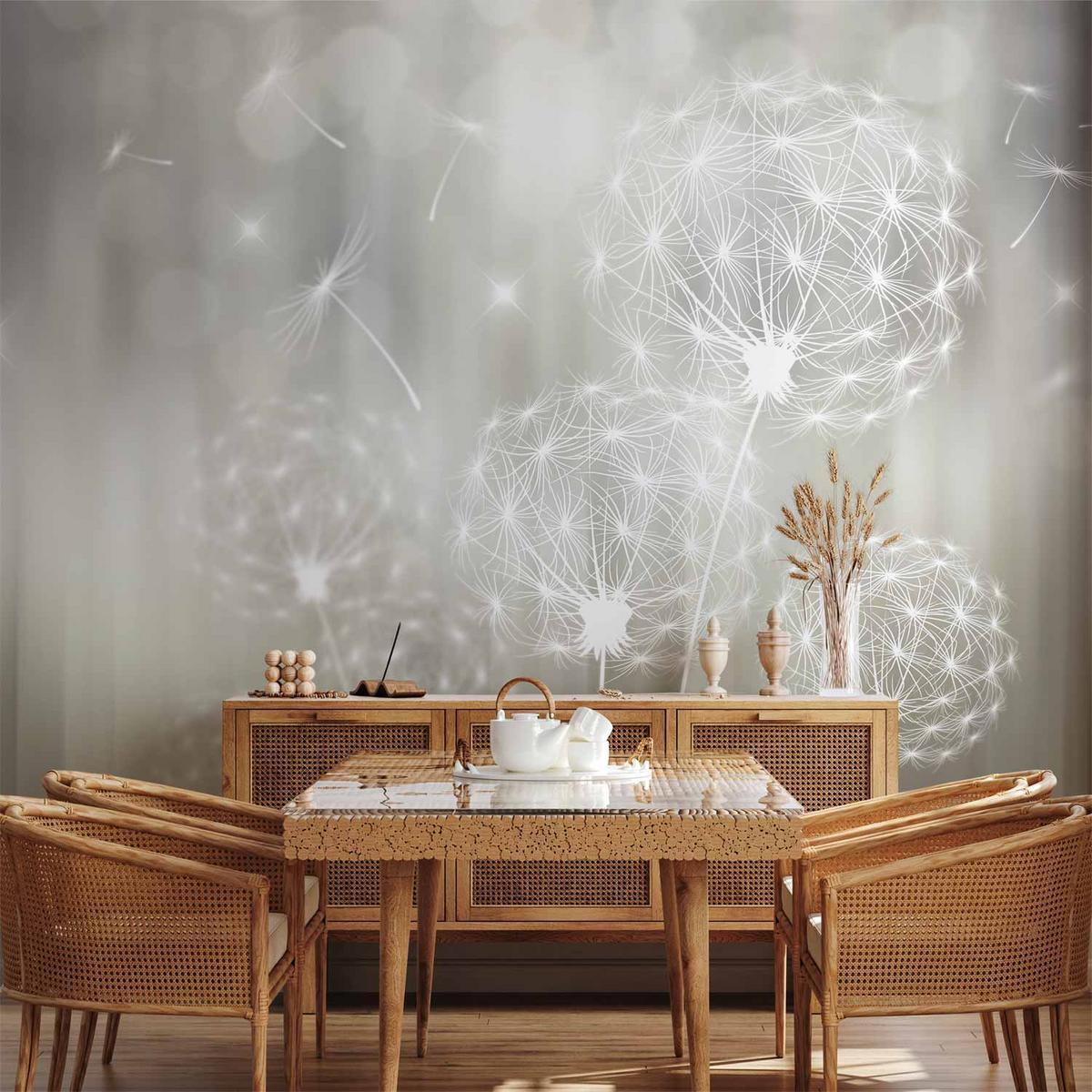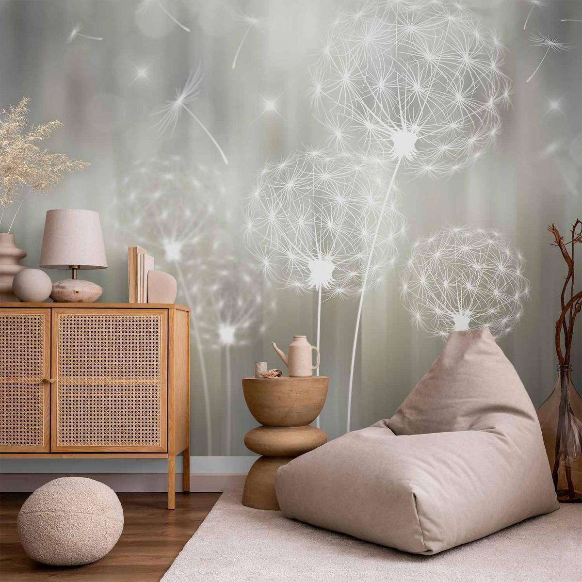 Papier peint - Fleurs de Pissenlit en Gris et Nature