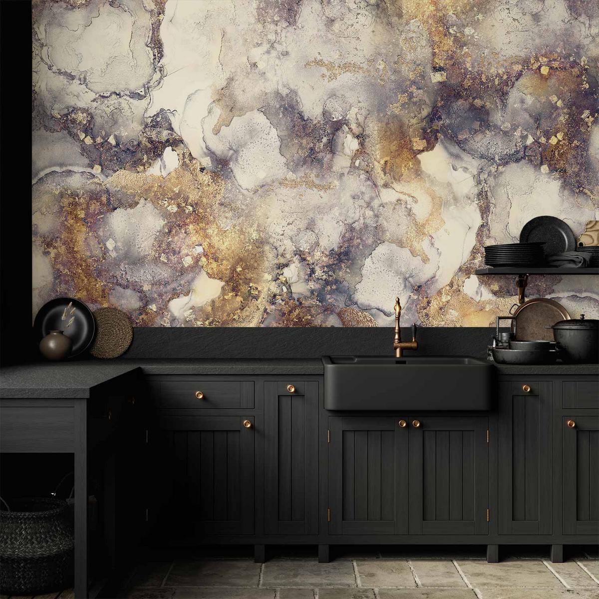 Papier Peint - Abstraction Aquarelle Marbre Rose Poudré avec Accents Dorés