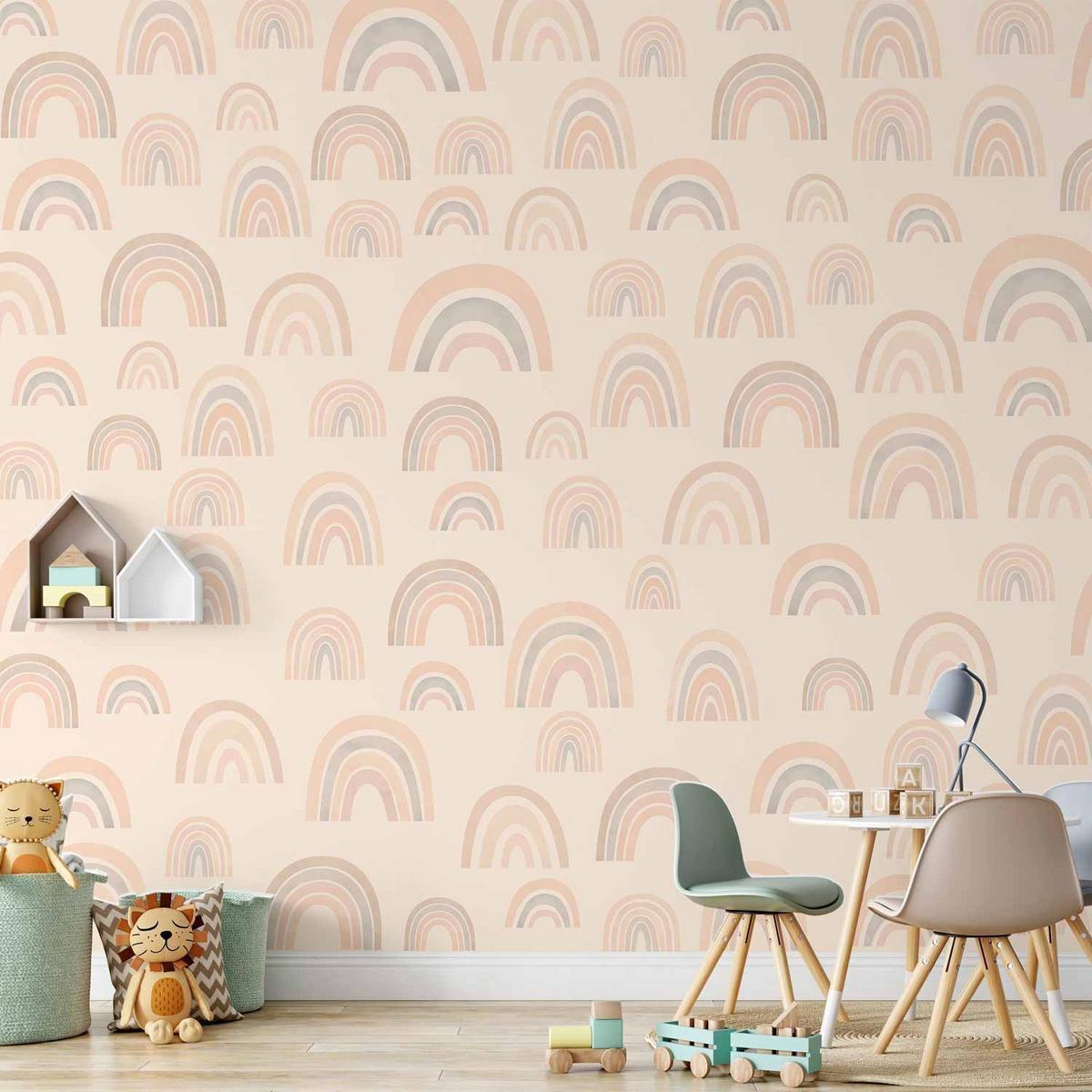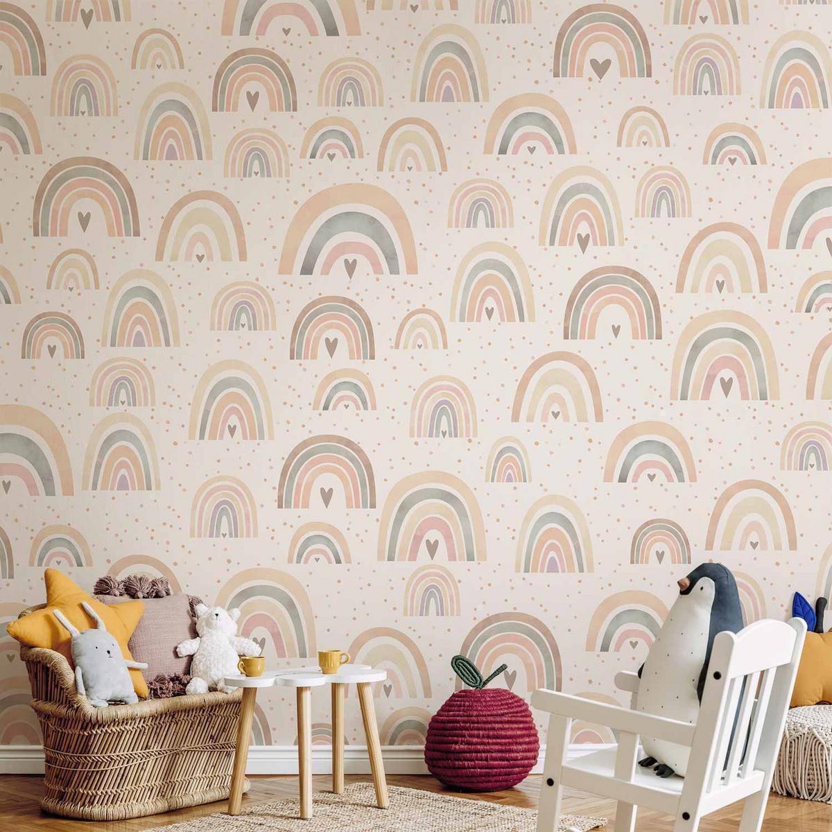 Paravent japonais - Oiseaux aux couleurs douces volant parmi les nuages et un arc-en-ciel sur fond beige