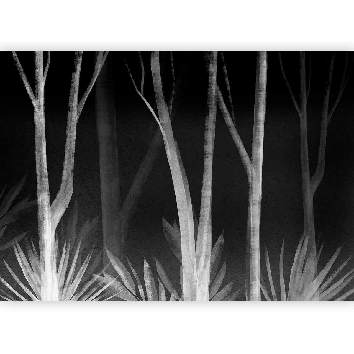 Papier peint – Ambiance nocturne de forêt avec arbres blancs sur fond noir