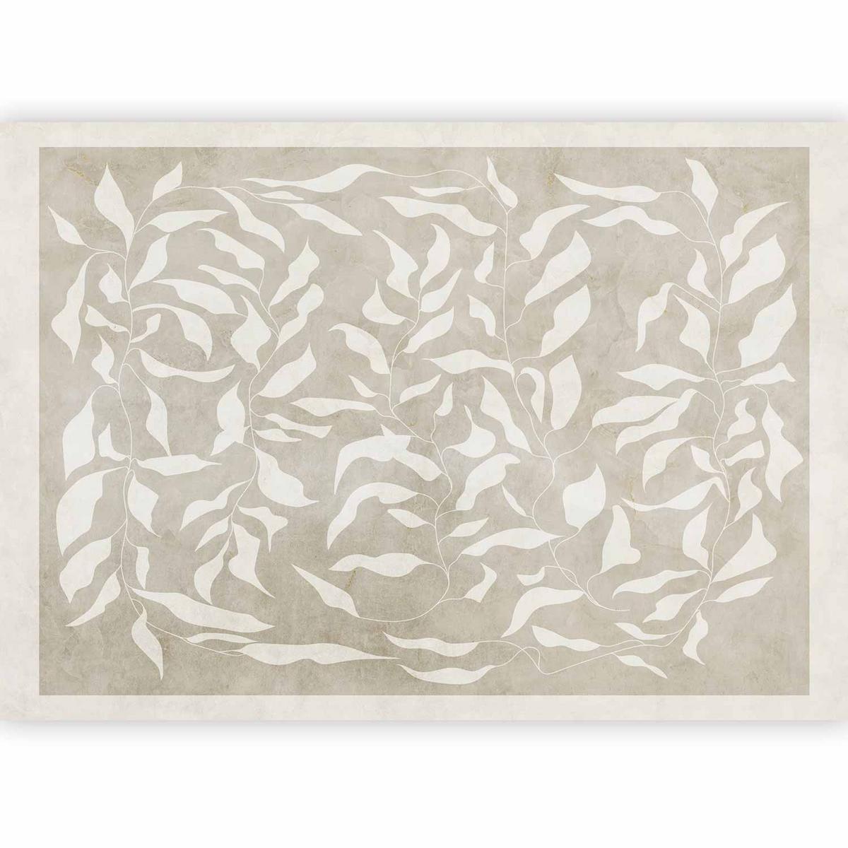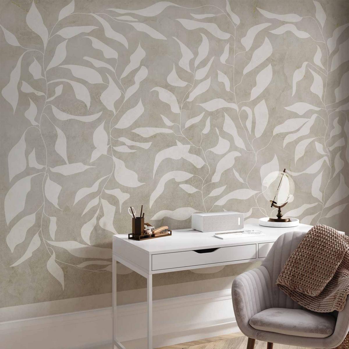 Papier peint – Feuilles blanches sur fond beige avec motif planté abstrait