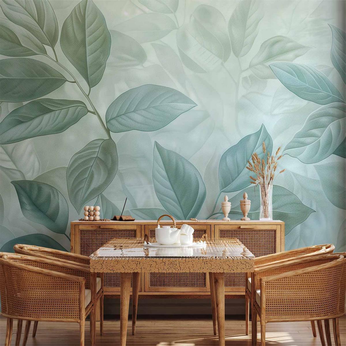Papier peint – Feuilles larges en nuances de vert et menthe : Motif botanique