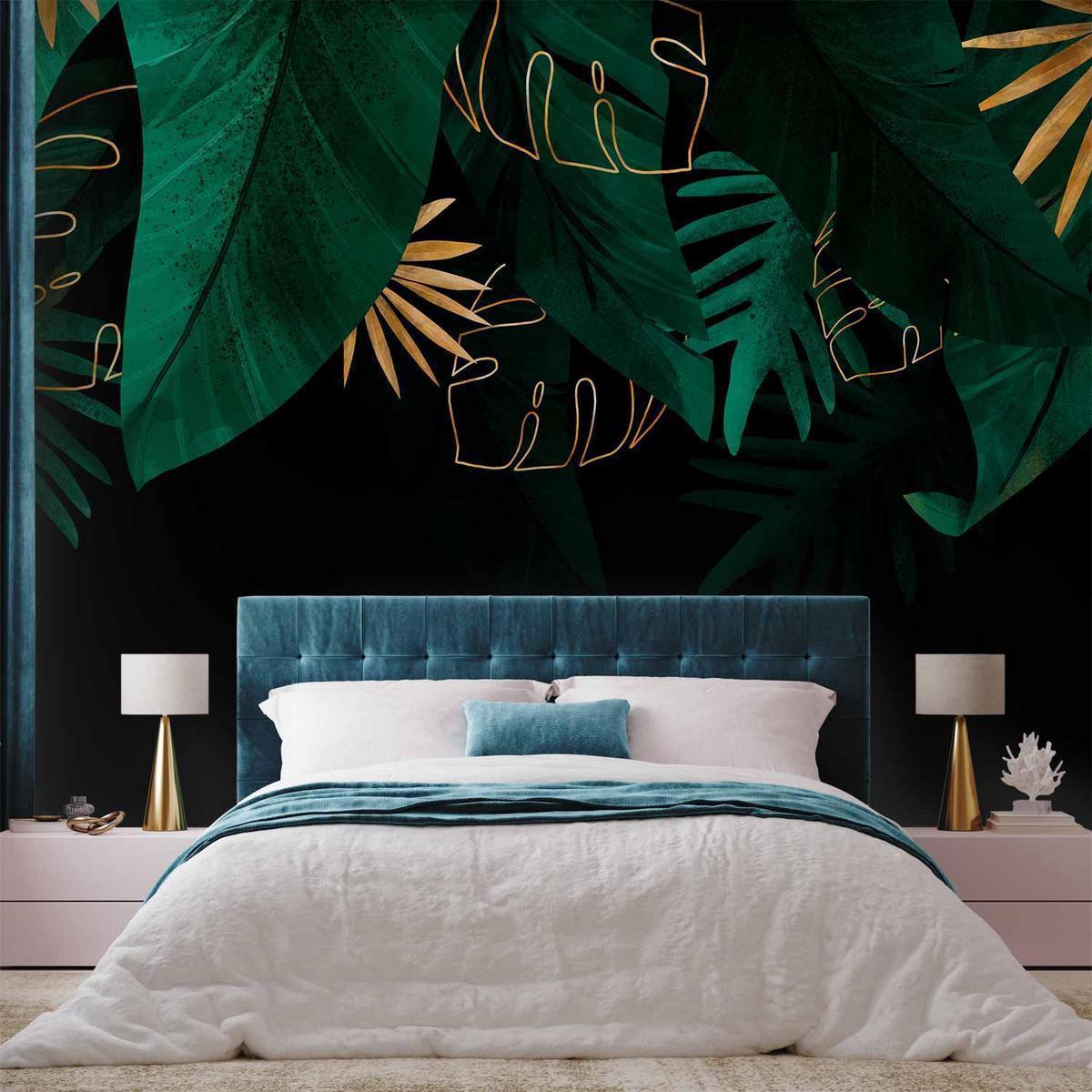 Papier peint – Jungle : motif de feuilles vertes et dorées sur fond noir
