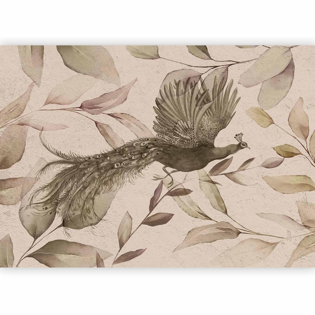 Papier peint – Oiseaux parmi les feuilles avec paon aux tonalités fraîches