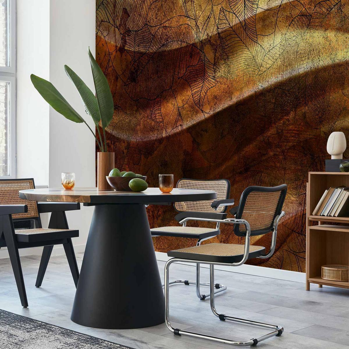 Transformez votre intérieur avec le Papier peint – Or liquide – Composition abstraite ondulée avec motifs de feuilles. Ce revêtement mural haut de gamme allie esthétique raffinée et praticité, grâce à sa finition lavable et adhésive, tout en ajoutant une touche artistique à votre espace.
