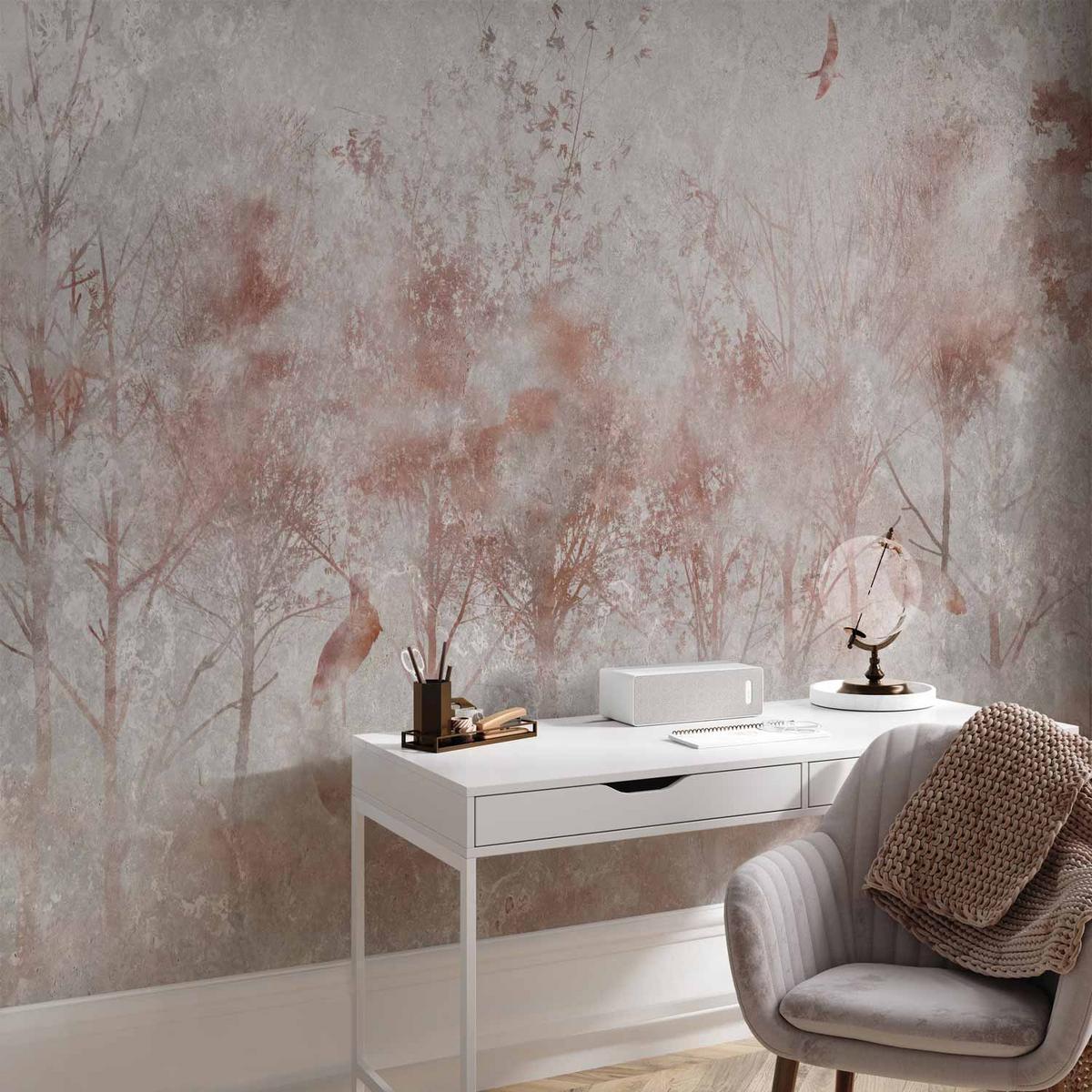 Papier peint – Paysage d’automne abstrait avec arbres et oiseaux sur fond texturé