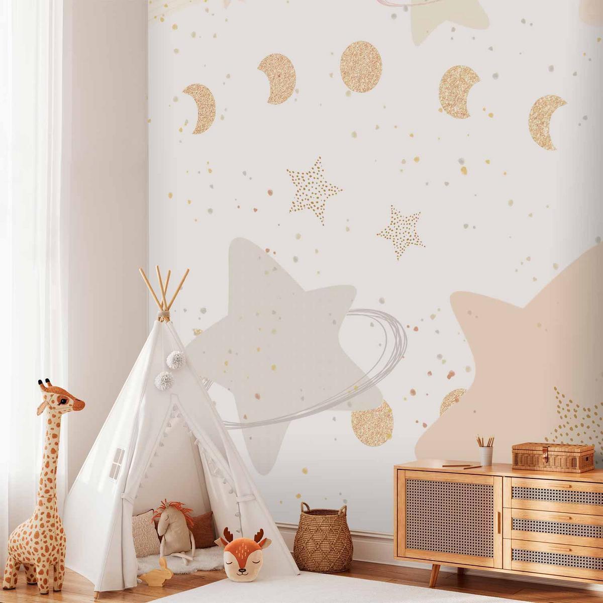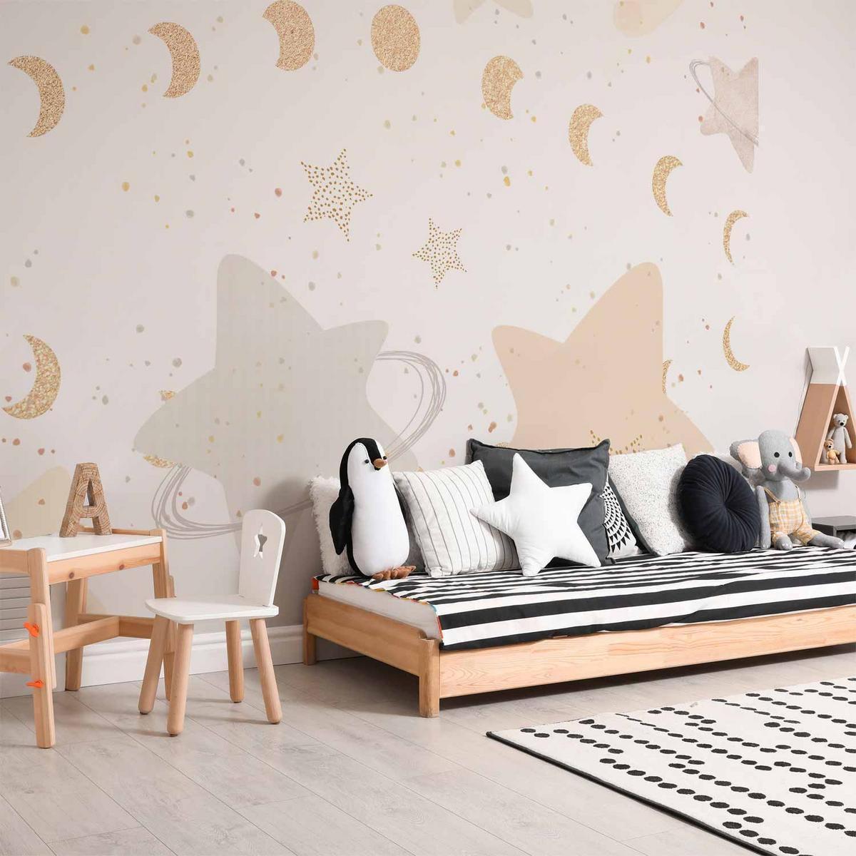 Apportez une touche magique à la chambre de vos enfants avec le Papier peint – Phases de la Lune parmi les Étoiles. Ce papier peint premium combine charme et praticité grâce à sa finition adhésive et lavable, créant un environnement serein et enchanteur.